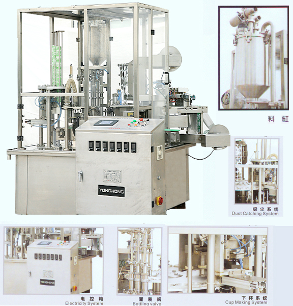 本機(jī)器是專為紙杯、塑料杯而設(shè)計(jì)的灌裝封口機(jī),集機(jī)械手下杯、頂杯灌裝、制蓋、封口、卷邊等為一體的自動(dòng)化設(shè)備,可灌裝果粒,采用進(jìn)口氣動(dòng)原件,人機(jī)界面控制,具有占地面積小、自動(dòng)化程度高等優(yōu)點(diǎn)。